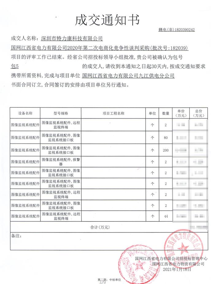 國網(wǎng)江西省電力有限公司2020年第二次電商化競爭性談判采購(批次號:182039)項(xiàng)目的評審工作已結(jié)束。經(jīng)省公司招投標(biāo)領(lǐng)導(dǎo)小組批準(zhǔn),我司(深圳市特力康科技有限公司)被確認(rèn)為包號包5(圖像監(jiān)視系統(tǒng)配件)的成交人,成交通知如下: