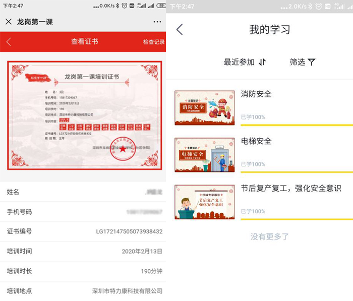 另外,防控期間為確保復工安全,我司全員進行了“龍崗第一課學習平臺”的培訓及“強安APP”的《節(jié)后復產(chǎn)復工,強化安全意識》的學習、考試、考證。