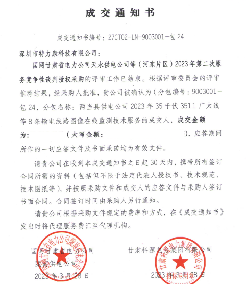 國(guó)網(wǎng)甘肅省電力公司天水供電公司等(河?xùn)|片區(qū)) 2023年第二次服務(wù)競(jìng)爭(zhēng)性談判授權(quán)采購(gòu)的評(píng)審工作已結(jié)束。根據(jù)評(píng)審委員會(huì)的評(píng)審?fù)扑]結(jié)果,經(jīng)采購(gòu)人批準(zhǔn),我司被確認(rèn)為(分包編號(hào): 9003001-包24,分包名稱:兩當(dāng)縣供電公司2023年35千伏3511廣太線等8條輸電線路圖像在線監(jiān)測(cè)技術(shù)服務(wù)的成交人,成交通知如下: