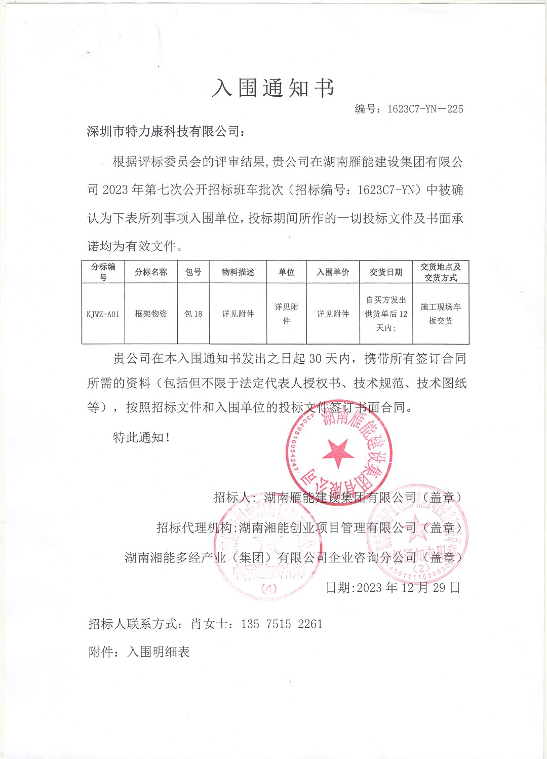 根據(jù)評(píng)標(biāo)委員會(huì)的評(píng)審結(jié)果,我司在湖南雁能建設(shè)集團(tuán)有限公司2023年第七次公開招標(biāo)班車批次(招標(biāo)編號(hào):1623C7-YN)中表現(xiàn)出色,經(jīng)過嚴(yán)格評(píng)審,我司被確認(rèn)為本次招標(biāo)項(xiàng)目的入圍單位。