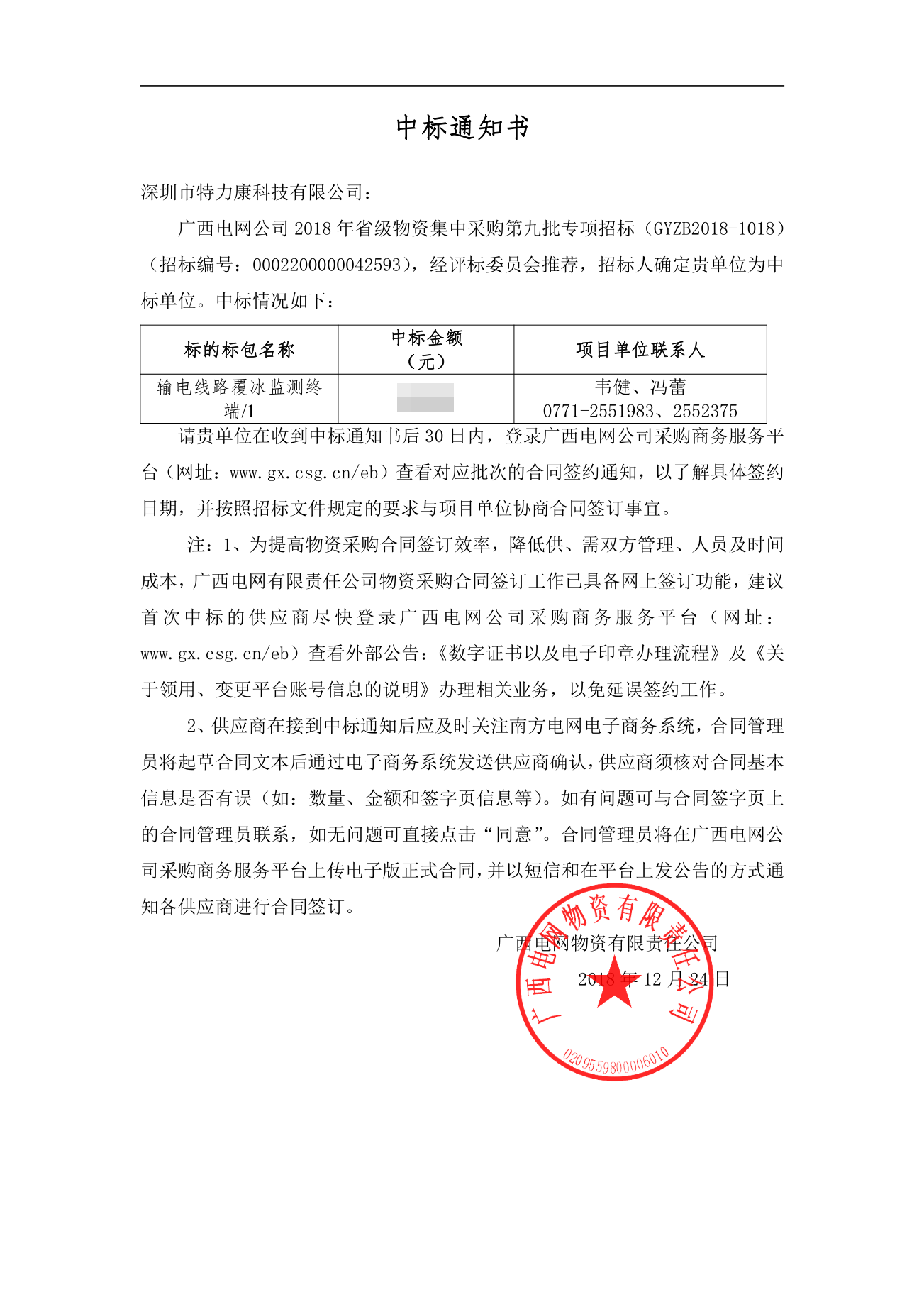 南方電網(wǎng)廣西供電局2018省級物資集中采購第九批專項招標項目評審工作已結束,經評審委員會評審,經南網(wǎng)廣西供電公司電力公司招投標領導小組批準,將評審結果公示。我司被確定為此項目簽約單位現(xiàn)將公告公示。