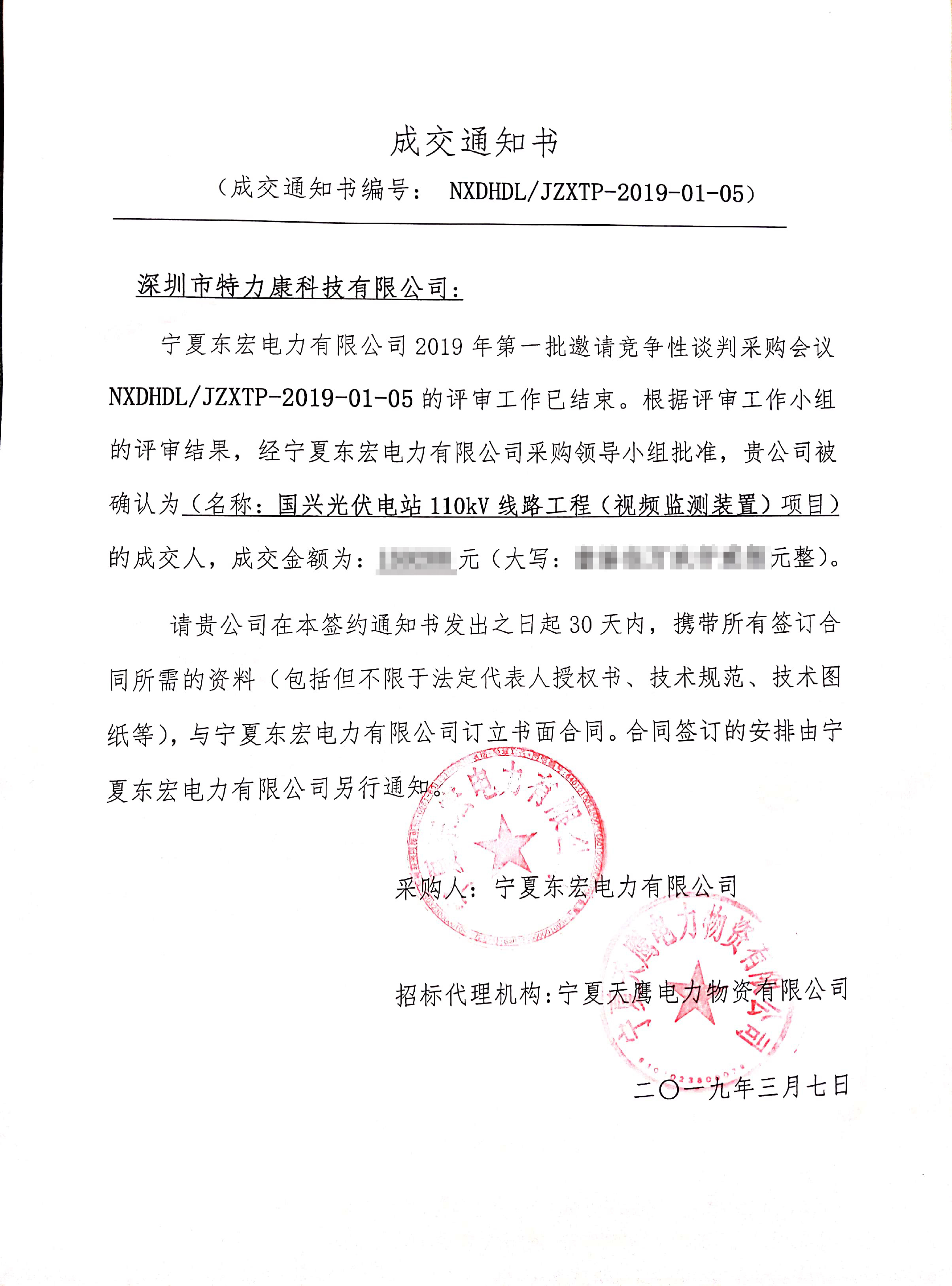寧夏東宏電力公司2019年第一批(視頻監(jiān)控裝置)邀請競爭性談判采購評審工作已結(jié)束,經(jīng)寧夏東宏電力公司招投標領(lǐng)導小組批準,確定我司為寧夏東宏電力公司2019年第一批(視頻監(jiān)控裝置)邀請競爭性談判采購項目中標單位。