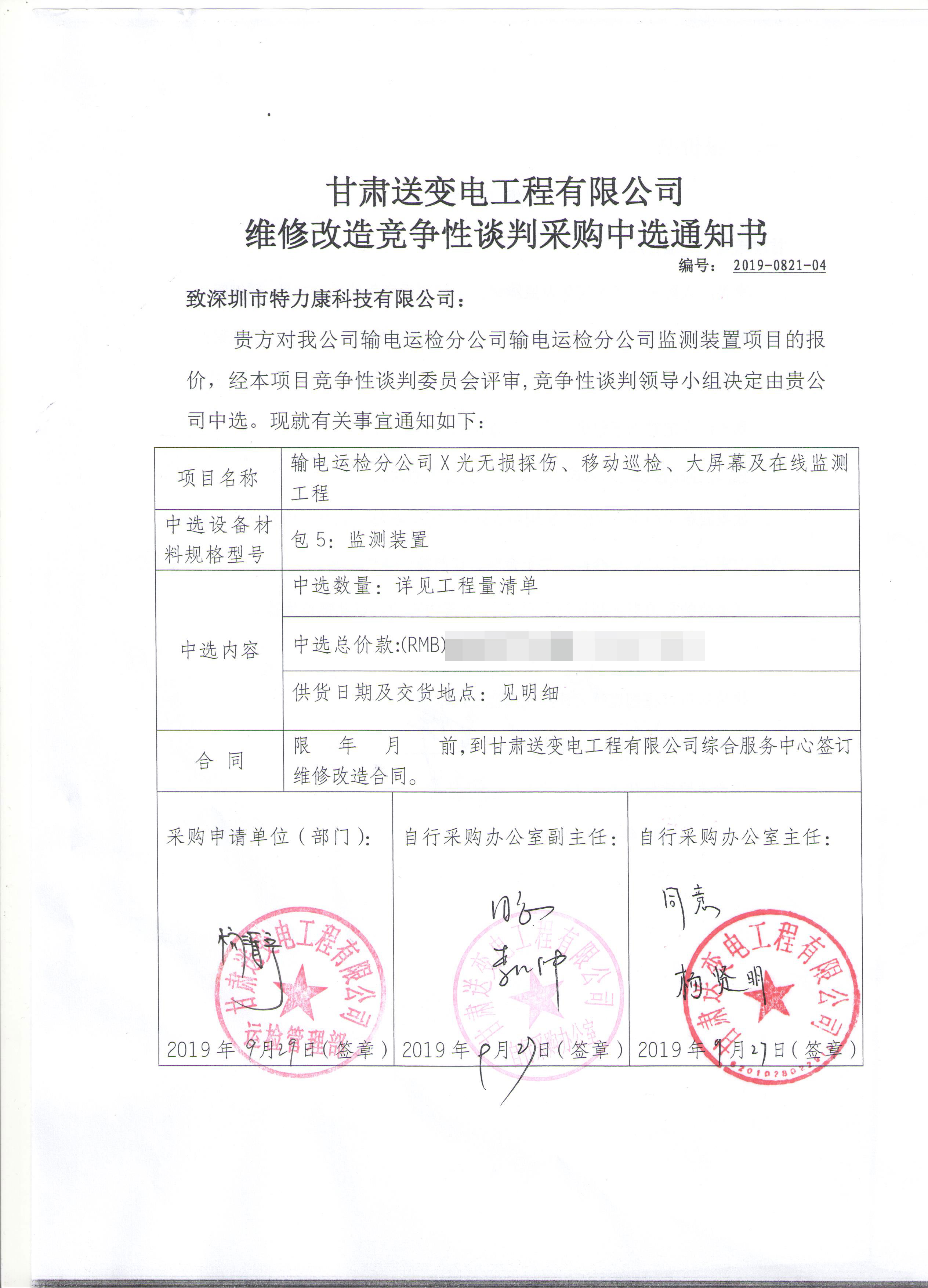 經(jīng)審委員會(huì)根據(jù)招標(biāo)程標(biāo)次評(píng)審、對(duì)有效標(biāo)書(shū)認(rèn)真評(píng)審,競(jìng)爭(zhēng)性談判領(lǐng)導(dǎo)小組確定我司為甘肅送變電工程有限公司維修改造競(jìng)爭(zhēng)性談判采購(gòu)項(xiàng)目中標(biāo)單位。