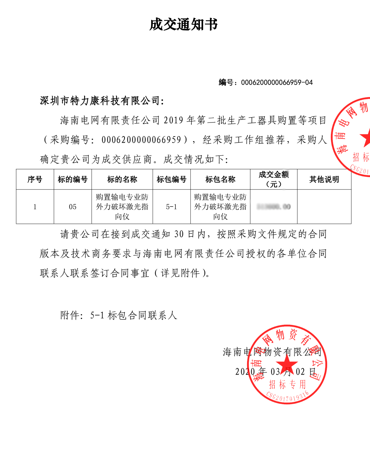 海南電網(wǎng)有限責(zé)任公司2019年第二批生產(chǎn)工器具購等項目(采購編號; 0000660509 )采購工作已完成。經(jīng)采購工作組推薦,采購人確定我司(深圳市特力康科技有限公司)成為本此標(biāo)包5-1購置輸電專業(yè)防外力破壞激光指向儀及標(biāo)包10-1購置防山火監(jiān)控裝置的成交供應(yīng)商,附成交通知書如下: