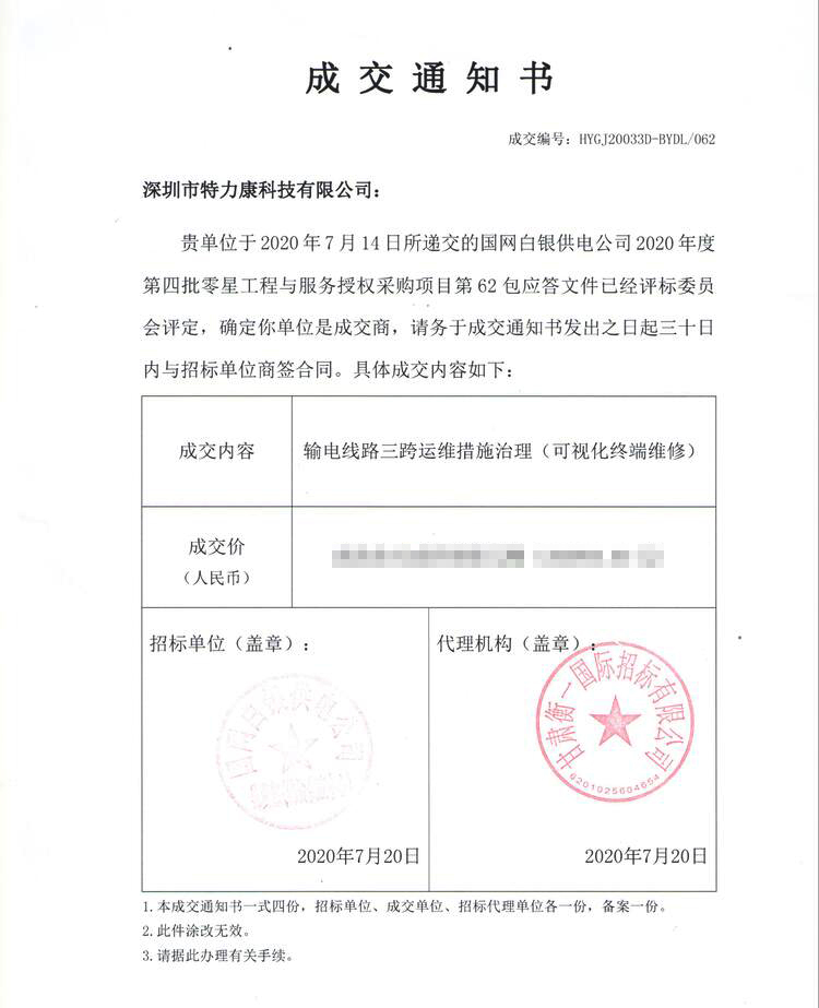 我司于2020年7月14日參加了國(guó)網(wǎng)白銀供電公司2020年度第四批零星工程與服務(wù)授權(quán)采購(gòu)項(xiàng)目第62包輸電線路三跨運(yùn)維措施治理(可視化終端維修)的投標(biāo)工作,所遞交的應(yīng)答文件經(jīng)評(píng)標(biāo)委員會(huì)評(píng)定,確定我司(深圳市特力康科技有限公司)是成交商,具體成交內(nèi)容如下: