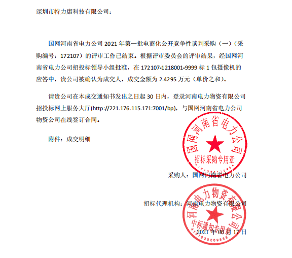 國網(wǎng)河南省電力公司2021年第一批電商化公開競爭性談判采購《- -) (果購編號: 172107) 的評審工作已結(jié)束。根據(jù)評審委員合的評審結(jié)果,經(jīng)國網(wǎng)河南省電力公司招投標(biāo)領(lǐng)導(dǎo)小組批準(zhǔn),在7210710101.9999標(biāo)1包攝像機的應(yīng)答中,責(zé)公司被確認(rèn)為成交人,中標(biāo)通知如下: