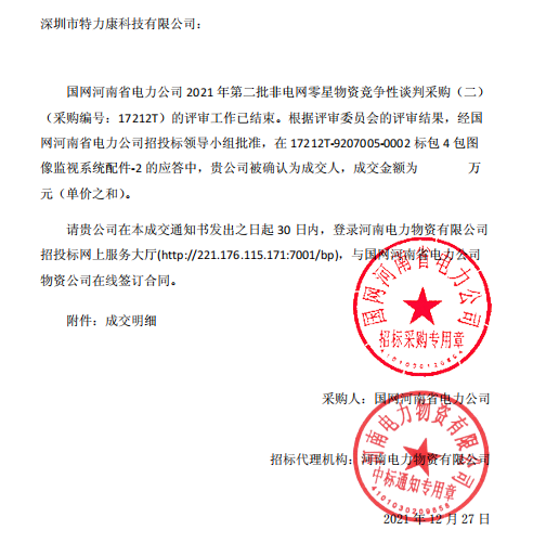 國網(wǎng)河南省電力公司2021年第二批非電網(wǎng)零星物資競爭性談判采購(二)(采購編號: 17212T) 的評審工作已結(jié)束。根據(jù)評審委員會的評審結(jié)果。經(jīng)國網(wǎng)河南省電力公司招投標領(lǐng)導小組批準,在172127-9207005-0002標包4包圖像監(jiān)視系統(tǒng)配件-2的應答中。貴公司被確認為成交人,成交通知如下: