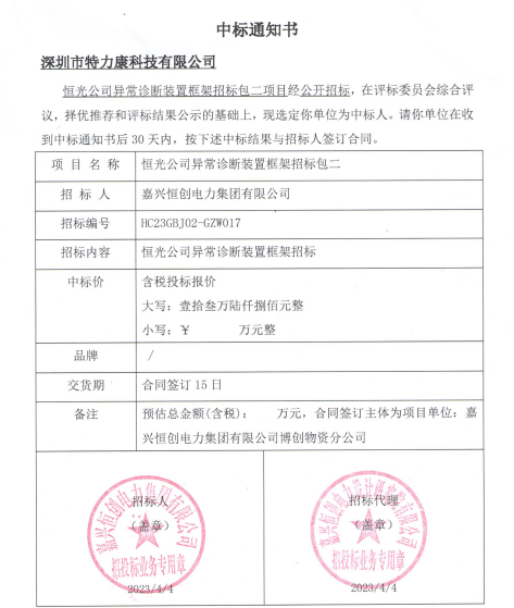 恒光公司異常診斷裝置框架招標(biāo)包二項(xiàng)目經(jīng)公開招標(biāo),在評(píng)標(biāo)委員會(huì)綜合評(píng)議,擇優(yōu)推薦和評(píng)標(biāo)結(jié)果公示的基礎(chǔ)上,現(xiàn)選定我司為中標(biāo)人,中標(biāo)通知如下: