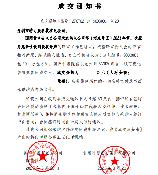 國網(wǎng)甘肅省電力公司天水供電公司等(河?xùn)|片區(qū)) 2023年第二次服務(wù)競爭性談判授權(quán)采購的評審工作已結(jié)束。根據(jù)評審委員會的評審?fù)扑]結(jié)果,經(jīng)采購人批準(zhǔn),我司被確認(rèn)為(分包編號: 9003001-包20,分包名稱:國網(wǎng)甘肅隴南供電公司330KV曬杏二線可視化裝置完善的成交人,成交通知書如下: