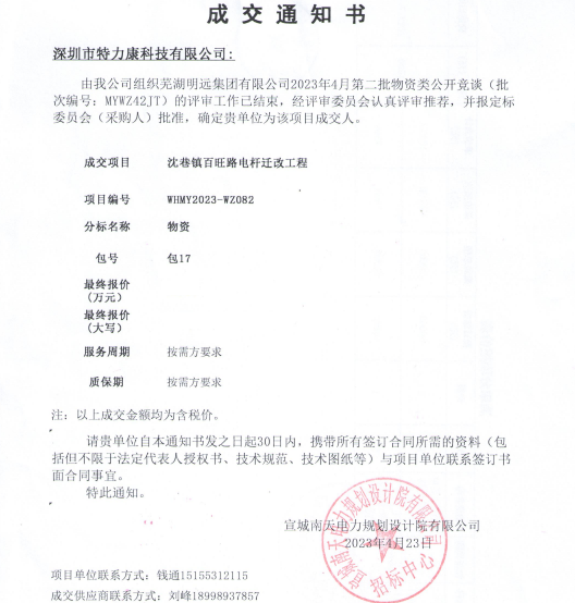 特力康中標(biāo)蕪湖明遠(yuǎn)集團(tuán)有限公司2023年4月第二批物資類(lèi)公開(kāi)競(jìng)談成